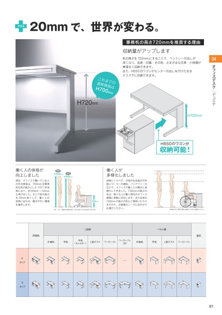 プラス20mmで、世界が変わる。事務机の高さ720mmを推奨する理由収納量がアップします机の高さを720mmにすることで、ペントレー引出しが深くなり、名刺・印鑑・その他、さまざまな文具・小物類が無理なく収納できます。また、H650のワゴンがセンター引出しを付けたままデスク下に収納できます。これまでの通常規格はH700mmH720mmH720mmH650のワゴンが収納可能!働く人の体格が向上しました現在、オフィスで働いている人の平均身長は、700mmを標準的な机の高さにした1971年当時に比べ、約40mm~50mmも伸びました。そこで机の高さを20mm高くして、働く人の体格に合わせ、働きやすい環境を提供します。男性+約50mm女性+約40mm720mm出典:「体力・運動能力調査報告書」1970年度および2009年度)文部科学省働く人が多様化しました当時にくらべて、女性の社会進出や外国人ワーカーの増加、バリアフリー化などで、オフィスで働く人が随分と多様化してきました。720mmの高さの机は、様々な人が働く現代のオフィス環境に柔軟に対応します。また従来の700mmの高さの机もご使用いただけますので、お客様のニーズに合わせてお選びください。※車椅子をご使用の際は、事前に寸法をご確認ください。L型脚パネル脚両棚机脇机片袖机平机平机(キャスター)L型デスクワークテーブルワークテーブル120°片袖机平机L型デスクワークテーブルKタイプSタイプ81