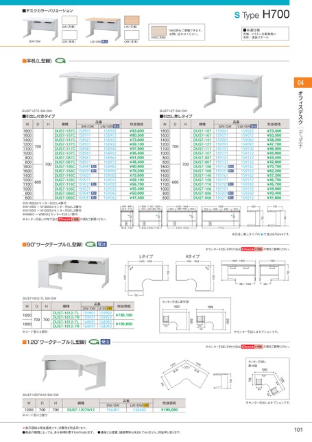 ■デスクカラーバリエーションSTypeH700SW(天板)LW(天板)SW/OWOW(本体)LW/OWOW(本体)NW2色もご準備できます。お問い合わせください。NW2天板)■共通仕様天板/メラミン化粧板貼り本体/塗装スチール04オフィスデスクデュエナ税抜価格¥73,400¥63,500¥58,200¥47,700¥46,900¥45,900¥44,400¥42,800¥70,700¥62,200¥57,200¥46,700¥45,700¥44,900¥43,400¥41,800品番SW/OWLW/OWDUS7-127SW/OW■引出し無しタイプWDH機種180016001400120011001000800600180016001400120011001000800600700600700DUS7-187159061DUS7-167159071DUS7-147159081DUS7-127159091DUS7-117159101DUS7-107159111DUS7-087159121DUS7-067159131DUS7-186159141DUS7-166159151DUS7-146159161DUS7-126159171DUS7-116159181DUS7-106159191DUS7-086159201DUS7-066159211159062159072159082159092159102159112159122159132159142159152159162159172159182159192159202159212■平机(L型脚)DUS7-127CSW/OW■引出し付きタイプWDH機種品番SW/OWLW/OW180016001400120011001000800600180016001400120011001000800600700600700DUS7-187C158901DUS7-167C158911DUS7-147C158921DUS7-127C158931DUS7-117C158941DUS7-107C158951DUS7-087C158961DUS7-067C158971DUS7-186C158981DUS7-166C158991DUS7-146C159001DUS7-126C159011DUS7-116C159021DUS7-106C159031DUS7-086C159041DUS7-066C159051158902158912158922158932158942158952158962158972158982158992159002159012159022159032159042159052税抜価格¥93,600¥80,500¥73,600¥59,100¥57,900¥56,400¥51,000¥48,400¥90,900¥79,200¥72,600¥58,100¥56,700¥55,400¥50,000¥47,400※引出し無しタイプの★寸法は675mmです。1719200919・1019・11191319・15192002007007006373534981800498353600700353637600・800510・7101000・1100・1200353555・655・7551400・1600599・799353637637200519・719Lタイプ1600・1800Rタイプ1600・18001600・18001200※センター引出しの内寸法はCheckP.106の表をご参照ください。700884・108448412007001200※センター引出しの内寸法はCheckP.106の表をご参照ください。※センター引出しはオプションです。120035355512003537001600・18001200センター引出し取付図16001800税抜価格¥185,100¥193,600※W1800はセンター引出し4個付※W1400〜W1600はセンター引出し3個付※W1000〜W1200はセンター引出し2個付※W600〜W800はセンター引出し1個付※センター引出しの内寸法はCheckP.106の表をご参照ください。■90°ワークテーブル(L型脚)DUS7-1612-7LSW/OWWDH機種16001800700700※コード受け3個付DUS7-1612-7LDUS7-1612-7RDUS7-1812-7LDUS7-1812-7R品番SW/OW159901159921168081168091LW/OW在庫限159902159922168082168092■120°ワークテーブル(L型脚)センター引出し取付図1200353353※センター引出しはオプションです。12007007000021120°007DUS7-1207W12SW/OWWD1200700H700※コード受け2個付機種DUS7-1207W12SW/OW156481品番LW/OW在庫限156482税抜価格¥199,0001200※表示価格は税抜価格です。消費税を別途承ります。●商品の種類によっては、多少納期を要するものもあります。●価格には運賃、諸経費等は含まれておりません。別途申し受けます。101