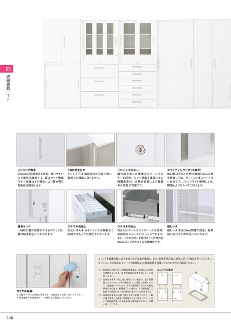 ヒンジドア取手230mmの大型取手を採用。握りやすいので操作も簡単です。扉はラッチ機能付きで地震などの揺れにより扉が開く危険性を軽減します。180°開きドアヒンジドアは180°開きが可能で狭い通路でも邪魔になりません。リバーシブルキー鍵の抜き差しが簡単なリバーシブルキーを採用。ロック状態を確認できる開閉表示付。内筒交換錠により鍵番号の変更が可能です。スライディングドア(3枚戸)開口間口が広く中央の書類の出し入れも快適に行え、オフィスの省スペース化に有効です。リンクスライド機構により、開閉もよりスムーズに行えます。鍵ポケット一時的に鍵の保管ができるポケット付。鍵の紛失防止につながります。ラテラル引出し引出しはA4・B4ファイルを無駄なく収納できるように設計されています。ラテラル引出し引出しはボールスライドレールを採用、収納物をスムーズに出し入れできます。また、1つの引出しを開けるとその他の引出しにロックがかかる安全機構付です。棚ピッチ棚ピッチは26.2mm間隔で設定、収納物に合わせた有効内寸がとれます。ユニットを設置の際は必ず本体の上下左右を連結し、また、転倒予防の為に壁又は床への固定を行ってください。オプションで転倒防止プレートや転倒防止対策用金具を用意しておりますのでご相談ください。ユニットの連結(1)転倒防止対策のない壁面収納家具は、転倒による怪我の原因となります。必ず転倒防止対策を施して、ご使用ください。(2)壁面収納家具の施工後に移設したい場合は、必ず設置施工のメーカー(とその販売店)にご相談ご依頼ください。設置施工のメーカー(とその販売店)又はその指定業者以外の者が、移設施工した場合は、その移設施工に起因する事故には一切の責任は負うことが出来ません。(3)壁面収納家具は大型で施工を伴う家具ですから、一般の置き家具とは構造・体積等が大きく異なります。十分に「取扱説明書」の安全条項を確認厳守のほど、お願い申し上げます。ダイヤル錠扉※IC錠タイプのご用意も可能です。担当者までお問い合わせください。※管理者用の非常開錠キー(有料)をご用意しております。148