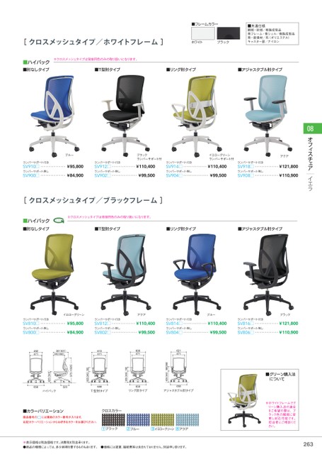 [クロスメッシュタイプ/ホワイトフレーム]ホワイトブラック■フレームカラー■共通仕様脚部・肘部/樹脂成型品背フレーム・背シェル/樹脂成型品背・座張材/布(ポリエステル)キャスター部/ナイロン■ハイバック■肘なしタイプ※クロスメッシュタイプは背座同色のみの取り扱いになります。■T型肘タイプ■リング肘タイプ■アジャスタブル肘タイプ08オフィスチェアイエラアクアランバーサポート付きSV918□・・・・・・・・・・・・・・¥121,800ランバーサポート無しSV908□・・・・・・・・・・・・・・¥110,900ブルーランバーサポート付きSV910□・・・・・・・・・・・・・・・¥95,800ランバーサポート無しSV900□・・・・・・・・・・・・・・・¥84,900ブラックランバーサポート付ランバーサポート付きSV912□・・・・・・・・・・・・・・¥110,400イエローグリーンランバーサポート付ランバーサポート付きSV914□・・・・・・・・・・・・・・¥110,400ランバーサポート無しSV902□・・・・・・・・・・・・・・・¥99,500ランバーサポート無しSV904□・・・・・・・・・・・・・・・¥99,500[クロスメッシュタイプ/ブラックフレーム]■ハイバック■肘なしタイプ※クロスメッシュタイプは背座同色のみの取り扱いになります。■T型肘タイプ■リング肘タイプ■アジャスタブル肘タイプ■グリーン購入法について※ホワイトフレームでグリーン購入法の適合をご希望の際は、ブラック色の脚部に変更し対応可能です。担当者にご相談ください。658320ハイバック658T型肘タイプ658リング肘タイプ658アジャスタブル肘タイプ425(545)188(288)425(545)192425(545)192975(1095)425(545)492471581(631)440490)613471606471621471■カラーバリエーションクロスカラー商品番号の右記カラーバリエーションからお好きなカラーをお選びください。には張地のカラー番号が入ります。ブラックブルーイエローグリーンアクア※表示価格は税抜価格です。消費税を別途承ります。●商品の種類によっては、多少納期を要するものもあります。●価格には運賃、諸経費等は含まれておりません。別途申し受けます。263イエローグリーンアクアブルーブラックランバーサポート付きSV810□・・・・・・・・・・・・・・・¥95,800ランバーサポート無しSV800□・・・・・・・・・・・・・・・¥84,900ランバーサポート付きSV812□・・・・・・・・・・・・・・¥110,400ランバーサポート無しSV802□・・・・・・・・・・・・・・・¥99,500ランバーサポート付きSV814□・・・・・・・・・・・・・・¥110,400ランバーサポート無しSV804□・・・・・・・・・・・・・・・¥99,500ランバーサポート付きSV816□・・・・・・・・・・・・・・¥121,800ランバーサポート無しSV806□・・・・・・・・・・・・・・¥110,900