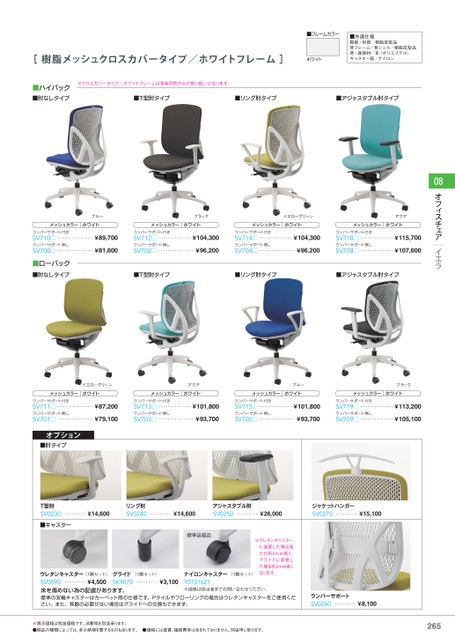 [樹脂メッシュクロスカバータイプ/ホワイトフレーム]ホワイト■フレームカラー■共通仕様脚部・肘部/樹脂成型品背フレーム・背シェル/樹脂成型品背・座張材/布(ポリエステル)キャスター部/ナイロン■ハイバック■肘なしタイプ※クロスカバータイプ/ホワイトフレームは背座同色のみの取り扱いになります。■T型肘タイプ■リング肘タイプ■アジャスタブル肘タイプ08オフィスチェアイエラブルーメッシュカラー|ホワイトランバーサポート付きSV710□・・・・・・・・・・・・・・・¥89,700ランバーサポート無しSV700□・・・・・・・・・・・・・・・¥81,600ブラックイエローグリーンアクアメッシュカラー|ホワイトランバーサポート付きSV712□・・・・・・・・・・・・・・¥104,300ランバーサポート無しSV702□・・・・・・・・・・・・・・・¥96,200メッシュカラー|ホワイトランバーサポート付きSV714□・・・・・・・・・・・・・・¥104,300ランバーサポート無しSV704□・・・・・・・・・・・・・・・¥96,200メッシュカラー|ホワイトランバーサポート付きSV718□・・・・・・・・・・・・・・¥115,700ランバーサポート無しSV708□・・・・・・・・・・・・・・¥107,600■ローバック■肘なしタイプ■T型肘タイプ■リング肘タイプ■アジャスタブル肘タイプイエローグリーンメッシュカラー|ホワイトランバーサポート付きSV711□・・・・・・・・・・・・・・・¥87,200ランバーサポート無しSV701□・・・・・・・・・・・・・・・¥79,100アクアメッシュカラー|ホワイトランバーサポート付きSV713□・・・・・・・・・・・・・・¥101,800ランバーサポート無しSV703□・・・・・・・・・・・・・・・¥93,700ブルーブラックメッシュカラー|ホワイトランバーサポート付きSV715□・・・・・・・・・・・・・・¥101,800ランバーサポート無しSV705□・・・・・・・・・・・・・・・¥93,700メッシュカラー|ホワイトランバーサポート付きSV719□・・・・・・・・・・・・・・¥113,200ランバーサポート無しSV709□・・・・・・・・・・・・・・¥105,100オプション■肘タイプT型肘SV0230・・・・・・・・・¥14,600■キャスターリング肘SV0240・・・・・・・・・¥14,600アジャスタブル肘SV0250・・・・・・・・・¥26,000ジャケットハンガーSV0270・・・・・・・・・¥15,100標準装備品※ウレタンキャスターに変更した場合高さが約6mm高く、グライドに変更した場合約2mm低くなります。(1脚セット)・・・・・・・・・¥4,500ウレタンキャスターSV0090床を傷めない為の配慮があります。標準の双輪キャスターはカーペット用の仕様です。Pタイルやフローリングの場合はウレタンキャスターをご使用ください。また、移動の必要がない場合はグライドへの交換もできます。ナイロンキャスター(1脚セット)Y01016Z1※価格は担当者までお問い合わせください。グライドSK9070(1脚セット)・・・・・・・・・¥3,100ランバーサポートSV0260・・・・・・・・・¥8,100※表示価格は税抜価格です。消費税を別途承ります。●商品の種類によっては、多少納期を要するものもあります。●価格には運賃、諸経費等は含まれておりません。別途申し受けます。265265