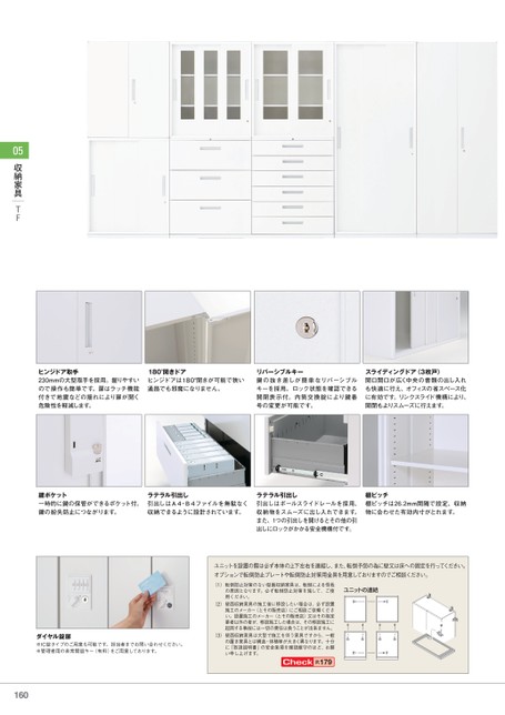 ヒンジドア取手230mmの大型取手を採用。握りやすいので操作も簡単です。扉はラッチ機能付きで地震などの揺れにより扉が開く危険性を軽減します。180°開きドアヒンジドアは180°開きが可能で狭い通路でも邪魔になりません。リバーシブルキー鍵の抜き差しが簡単なリバーシブルキーを採用。ロック状態を確認できる開閉表示付。内筒交換錠により鍵番号の変更が可能です。スライディングドア(3枚戸)開口間口が広く中央の書類の出し入れも快適に行え、オフィスの省スペース化に有効です。リンクスライド機構により、開閉もよりスムーズに行えます。鍵ポケット一時的に鍵の保管ができるポケット付。鍵の紛失防止につながります。ラテラル引出し引出しはA4・B4ファイルを無駄なく収納できるように設計されています。ラテラル引出し引出しはボールスライドレールを採用、収納物をスムーズに出し入れできます。また、1つの引出しを開けるとその他の引出しにロックがかかる安全機構付です。棚ピッチ棚ピッチは26.2mm間隔で設定、収納物に合わせた有効内寸がとれます。ユニットを設置の際は必ず本体の上下左右を連結し、また、転倒予防の為に壁又は床への固定を行ってください。オプションで転倒防止プレートや転倒防止対策用金具を用意しておりますのでご相談ください。(1)転倒防止対策のない壁面収納家具は、転倒による怪我の原因となります。必ず転倒防止対策を施して、ご使用ください。ユニットの連結05収納家具TFダイヤル錠扉※IC錠タイプのご用意も可能です。担当者までお問い合わせください。※管理者用の非常開錠キー(有料)をご用意しております。160(2)壁面収納家具の施工後に移設したい場合は、必ず設置施工のメーカー(とその販売店)にご相談ご依頼ください。設置施工のメーカー(とその販売店)又はその指定業者以外の者が、移設施工した場合は、その移設施工に起因する事故には一切の責任は負うことが出来ません。(3)壁面収納家具は大型で施工を伴う家具ですから、一般の置き家具とは構造・体積等が大きく異なります。十分に「取扱説明書」の安全条項を確認厳守のほど、お願い申し上げます。CheckP.179
