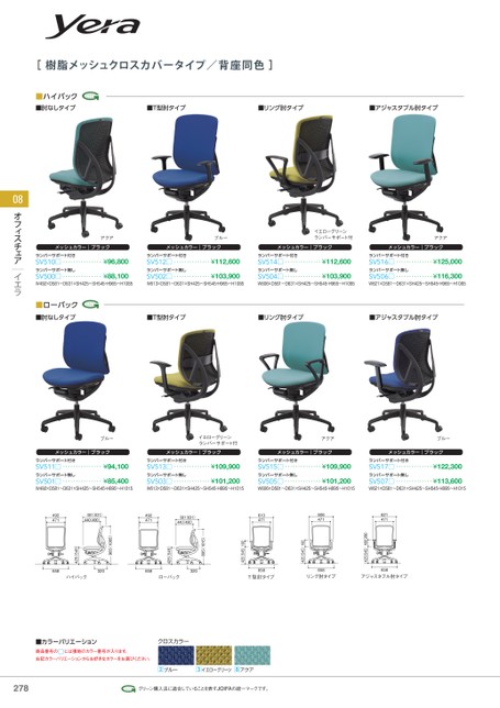 [樹脂メッシュクロスカバータイプ/背座同色]■ハイバック■肘なしタイプ■T型肘タイプ■リング肘タイプ■アジャスタブル肘タイプアクアブルーイエローグリーンランバーサポート付アクアメッシュカラー|ブラックメッシュカラー|ブラックメッシュカラー|ブラックメッシュカラー|ブラックランバーサポート付きSV510□・・・・・・・・・・・・・・・¥96,800ランバーサポート付きSV512□・・・・・・・・・・・・・・¥112,600ランバーサポート付きSV514□・・・・・・・・・・・・・・¥112,600ランバーサポート付きSV516□・・・・・・・・・・・・・・¥125,000ランバーサポート無しSV500□・・・・・・・・・・・・・・・¥88,100W492×D581〜D631×SH425〜SH545・H965〜H1085ランバーサポート無しSV502□・・・・・・・・・・・・・・¥103,900W613×D581〜D631×SH425〜SH545・H965〜H1085ランバーサポート無しSV504□・・・・・・・・・・・・・・¥103,900W606×D581〜D631×SH425〜SH545・H965〜H1085ランバーサポート無しSV506□・・・・・・・・・・・・・・¥116,300W621×D581〜D631×SH425〜SH545・H965〜H108508オフィスチェアイエラ■ローバック■肘なしタイプ■T型肘タイプ■リング肘タイプ■アジャスタブル肘タイプブルーイエローグリーンランバーサポート付アクアブルーメッシュカラー|ブラックメッシュカラー|ブラックメッシュカラー|ブラックメッシュカラー|ブラックランバーサポート付きSV511□・・・・・・・・・・・・・・・¥94,100ランバーサポート付きSV513□・・・・・・・・・・・・・・¥109,900ランバーサポート付きSV515□・・・・・・・・・・・・・・¥109,900ランバーサポート付きSV517□・・・・・・・・・・・・・・¥122,300ランバーサポート無しSV501□・・・・・・・・・・・・・・・¥85,400W492×D581〜D631×SH425〜SH545・H895〜H1015ランバーサポート無しSV503□・・・・・・・・・・・・・・¥101,200W613×D581〜D631×SH425〜SH545・H895〜H1015ランバーサポート無しSV505□・・・・・・・・・・・・・・¥101,200W606×D581〜D631×SH425〜SH545・H895〜H1015ランバーサポート無しSV507□・・・・・・・・・・・・・・¥113,600W621×D581〜D631×SH425〜SH545・H895〜H1015658320658320ハイバックローバック658T型肘タイプ658リング肘タイプ658アジャスタブル肘タイプ425(545)188(288)425(545)192425(545)192895(1015)425(545)965(1085)425(545)492471581631)440490)492471581631)440(490)613471606471621471■カラーバリエーションクロスカラー商品番号の右記カラーバリエーションからお好きなカラーをお選びください。には張地のカラー番号が入ります。ブルーイエローグリーンアクア278278グリーン購入法に適合していることを表すJOIFAの統一マークです。