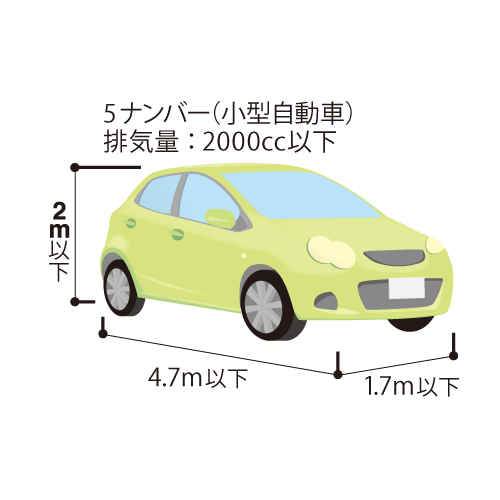 | 小型車/5ナンバー | 全長:4.7m以下 全幅:1.7m以下 全高:2.0m以下 | ●アクア ●フィット ●ノート ●ソリオ ●スイフト ●ライズ |