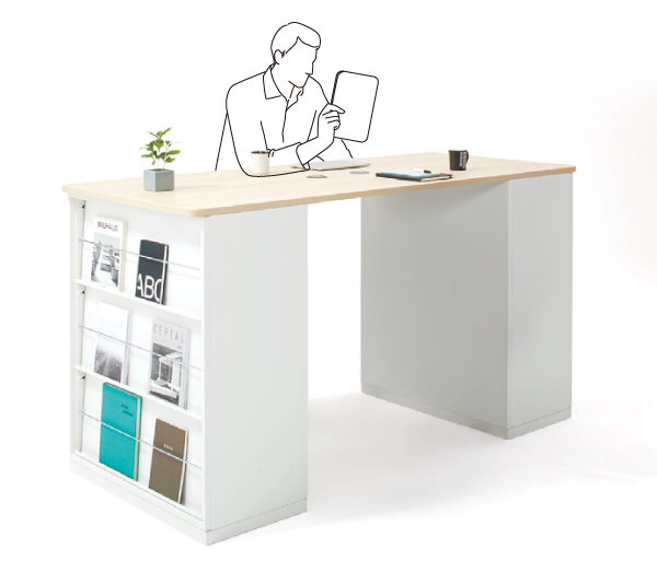 天板とキャビネットを組み合わせたブリッジタイプ。立ち作業やコミュニケーションを図る場としての利用はもちろん、キャビネットに資料やサンプルを置くことで、カウンタータイプの作業台としても有効に活用できます。